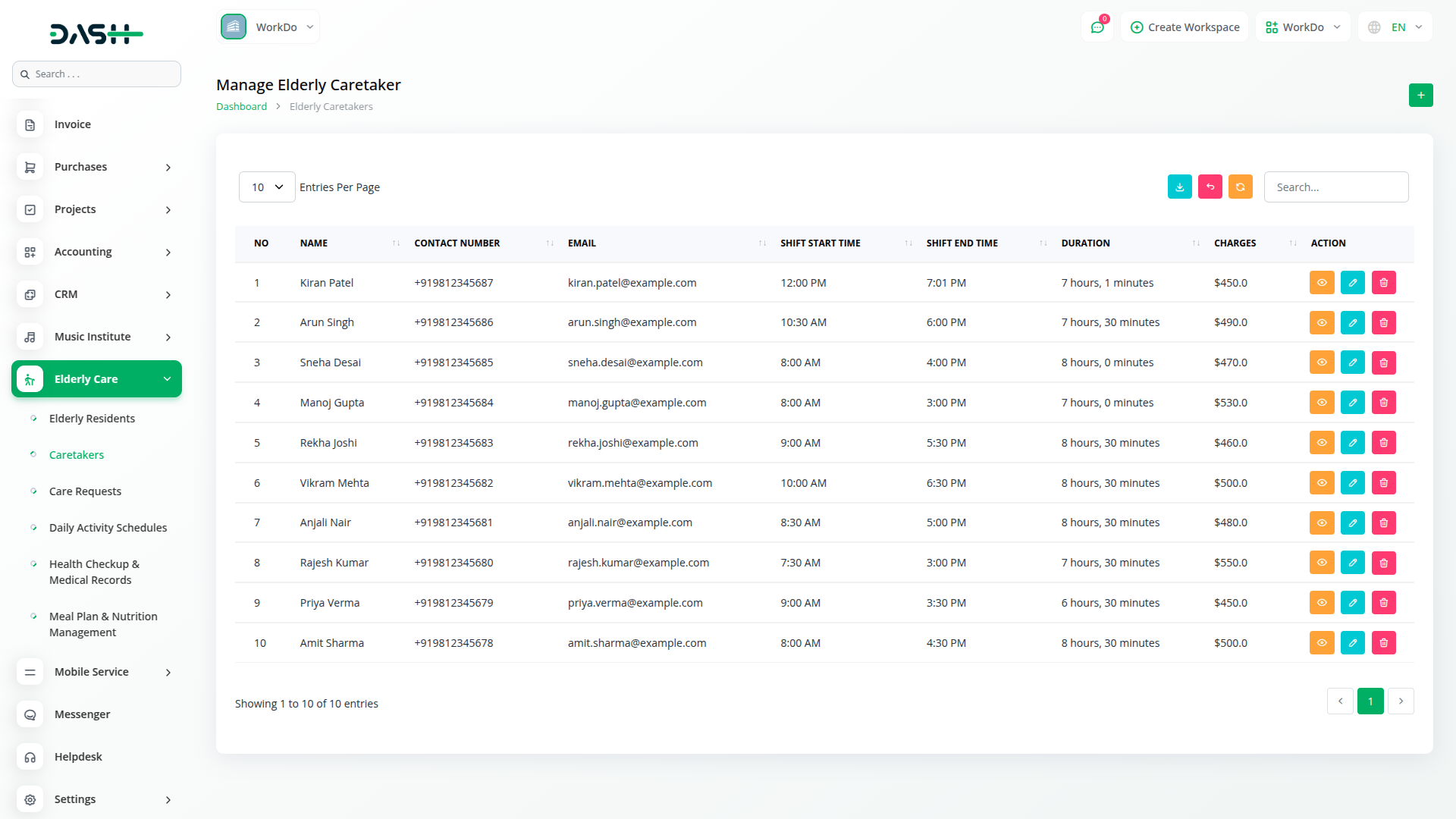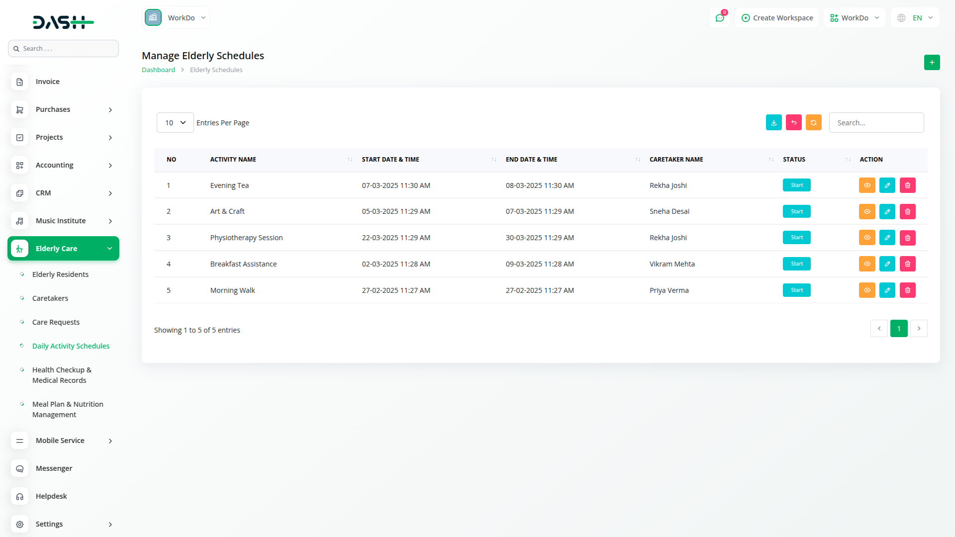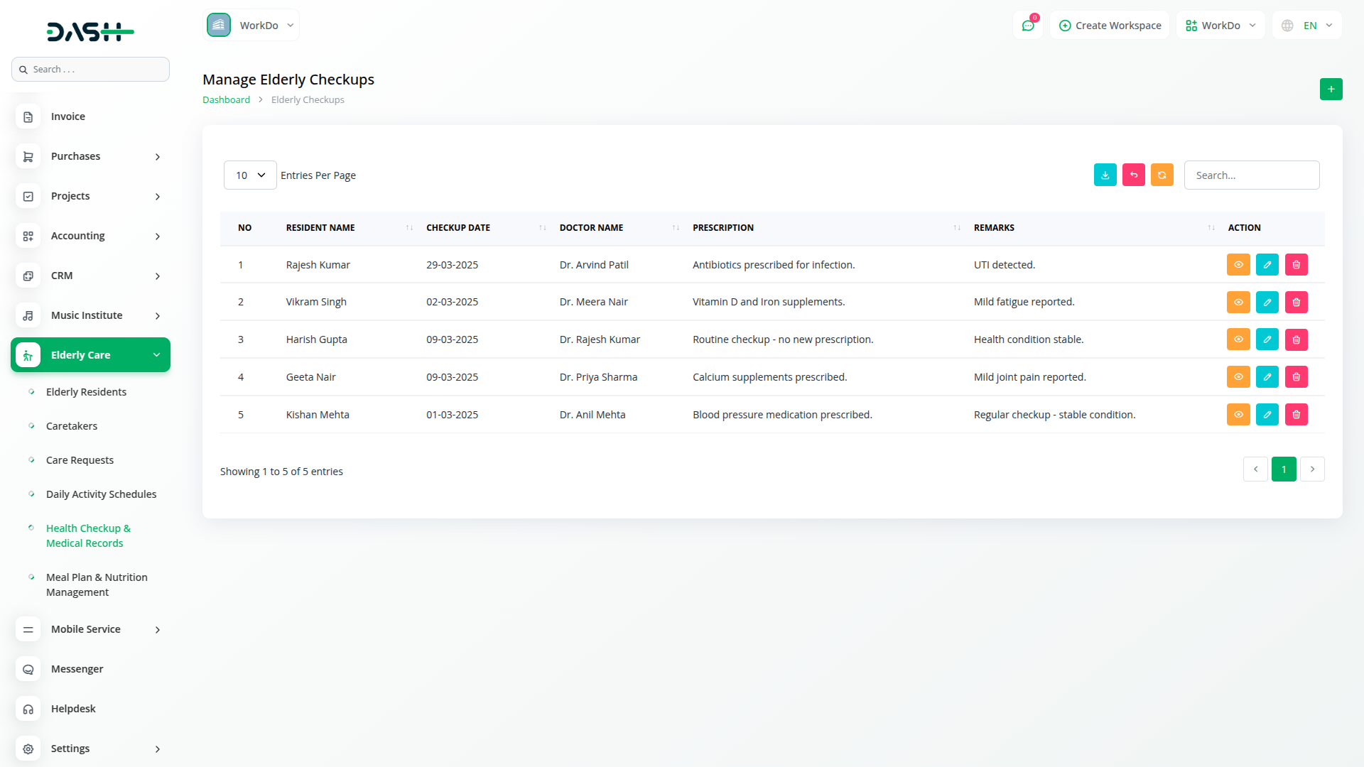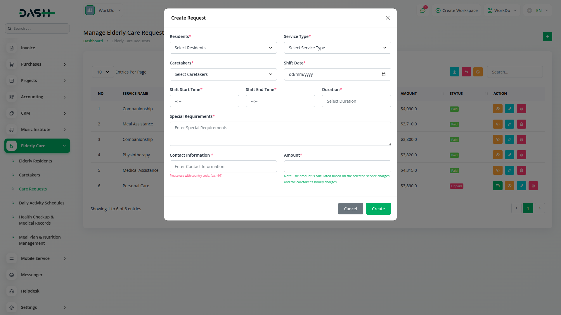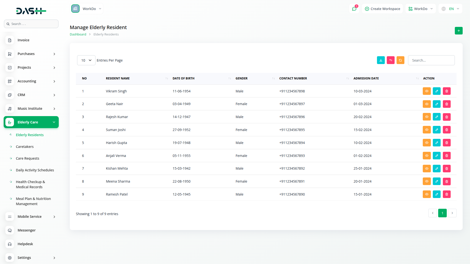 The Elderly Care Management module in Dash SaaS is designed to streamline the care and well-being of elderly residents. It provides a centralized platform to manage resident details, caretaker assignments, care requests, daily activity schedules, health checkups, medical records, and meal planning.